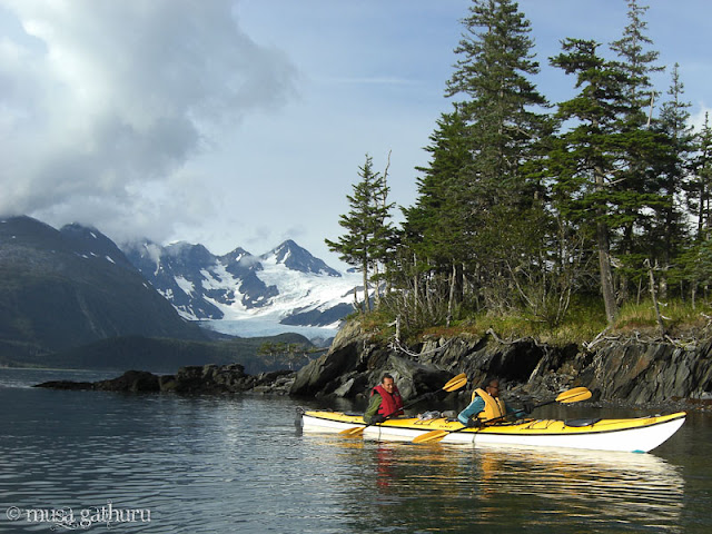 i hate to harp on this point, but alaska is sooo beautiful. we paddle under the bow of a giant cruise ship which in turn is dwarfed by the glacier-speckled mountains behind it. then across the sound and up along one side of the inlet.
