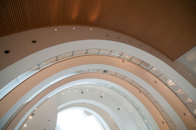 its right in the middle of all the shopping malls, and all the more refreshing for it. the bangkok art and culture center, before we even talk about the contents, is a stunning piece of architecture. you walk up the spiral walkway round the inside of the building stopping occasionally to look down at the concentric geometric patterns.